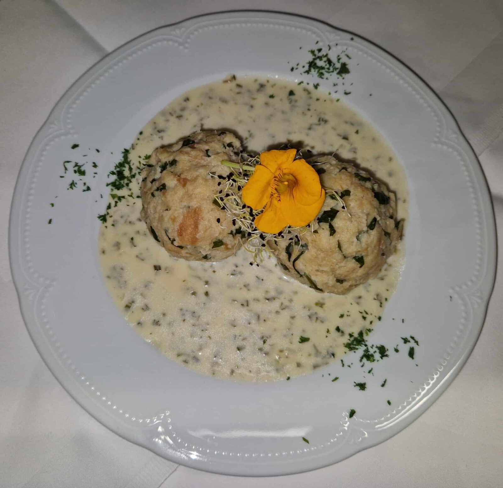 Hausgemachte Spinatknödel serviert mit einer Kräuter-Parmesan-Soße (9, A, C, F, G, I, J, M)
