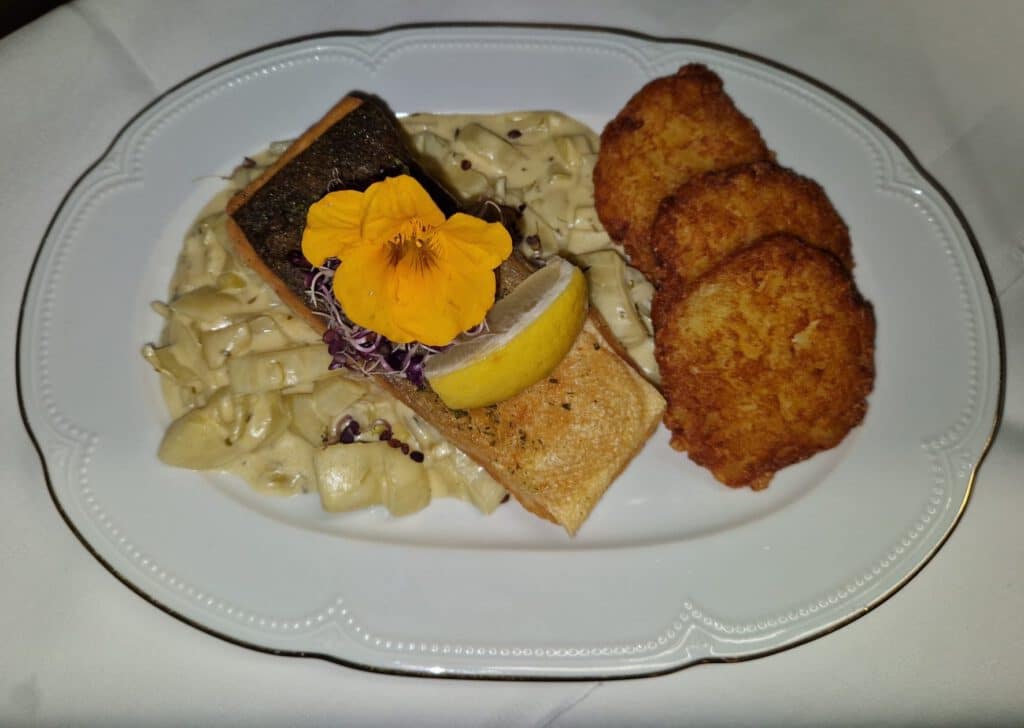 Gebratenes Wildlachsfilet auf Fenchel-Senf-Rahmgemüse dazu Kartoffelrösti (2, 9, A, D, F, G, J, M)